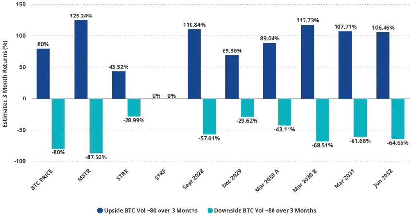这种非对称性风险的原因在于 STRK 的嵌入看涨期权目前处于深度虚值状态且为永久性质。在这种情况下,波动性超过一定水平的增加对期权最终进入实值的概率影响很小,从而使上行反应趋于平缓。相反,MSTR 当前波动率的下降会显著降低期权进入实值的概率,从而导致价格的大幅下跌。这种凸性的波动性敞口、有限的上行空间以及显著的下行风险是 STRK 风险特征的关键。换句话说,可以将 STRK 看作一种支付你持有看涨期权的证券,但其上行空间相较于直接购买 MSTR 更为有限。