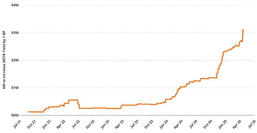 增加 MSTR 收益的每个基点所需资金(百万美元, 90 天移动平均)