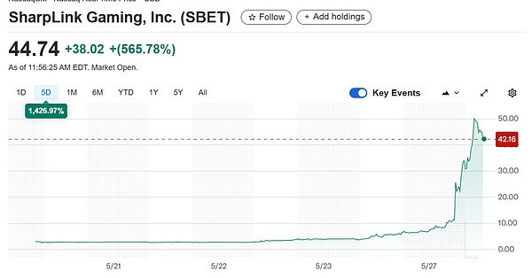 SharpLink 的核心业务——博彩营销——几乎无人问津,4.25 亿美元的 ETH 投资计划与其基本面完全脱节。它的股价暴涨,更多是投机资金和加密叙事的推动。