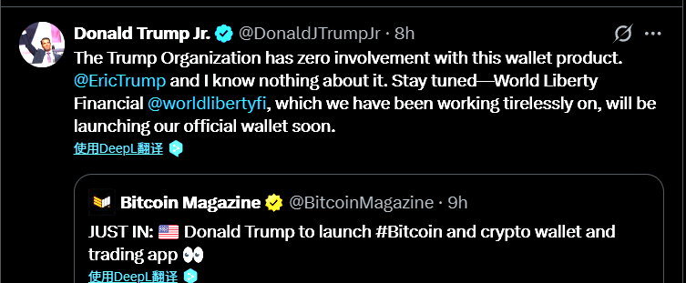 凌晨2点18分,特朗普长子、WLFI联合创始人Donald Trump Jr.在X平台发表声明澄清称:“特朗普集团与此钱包产品(Magic Eden与TRUMP Meme合作开发)没有任何关联。Eric Trump和我对此毫不知情。请继续关注——我们一直在努力推进的World Liberty Financial,将很快推出我们的官方钱包。”