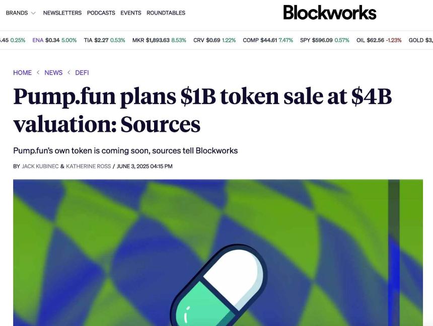6 月 4 日,据 Blockworks 报道,Pump.fun 计划发币,以 40 亿美元的完全稀释估值(FDV)筹集 10 亿美元,出售约 25% 的代币。