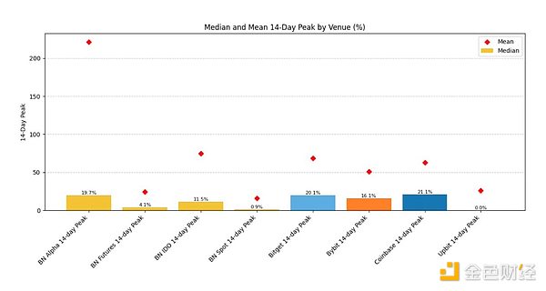 Binance Alpha表现最具爆发力(均值220%),但波动性较大;